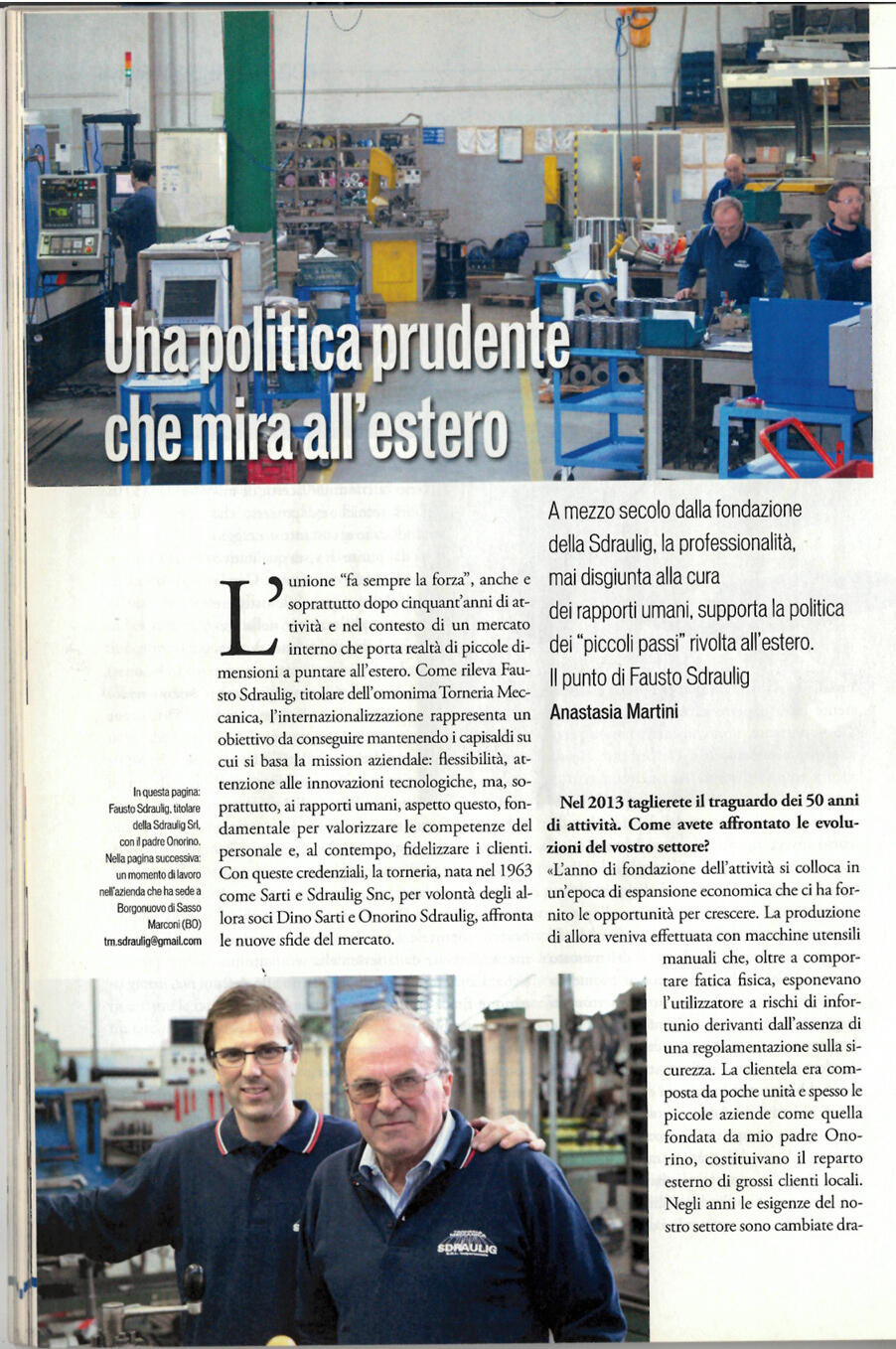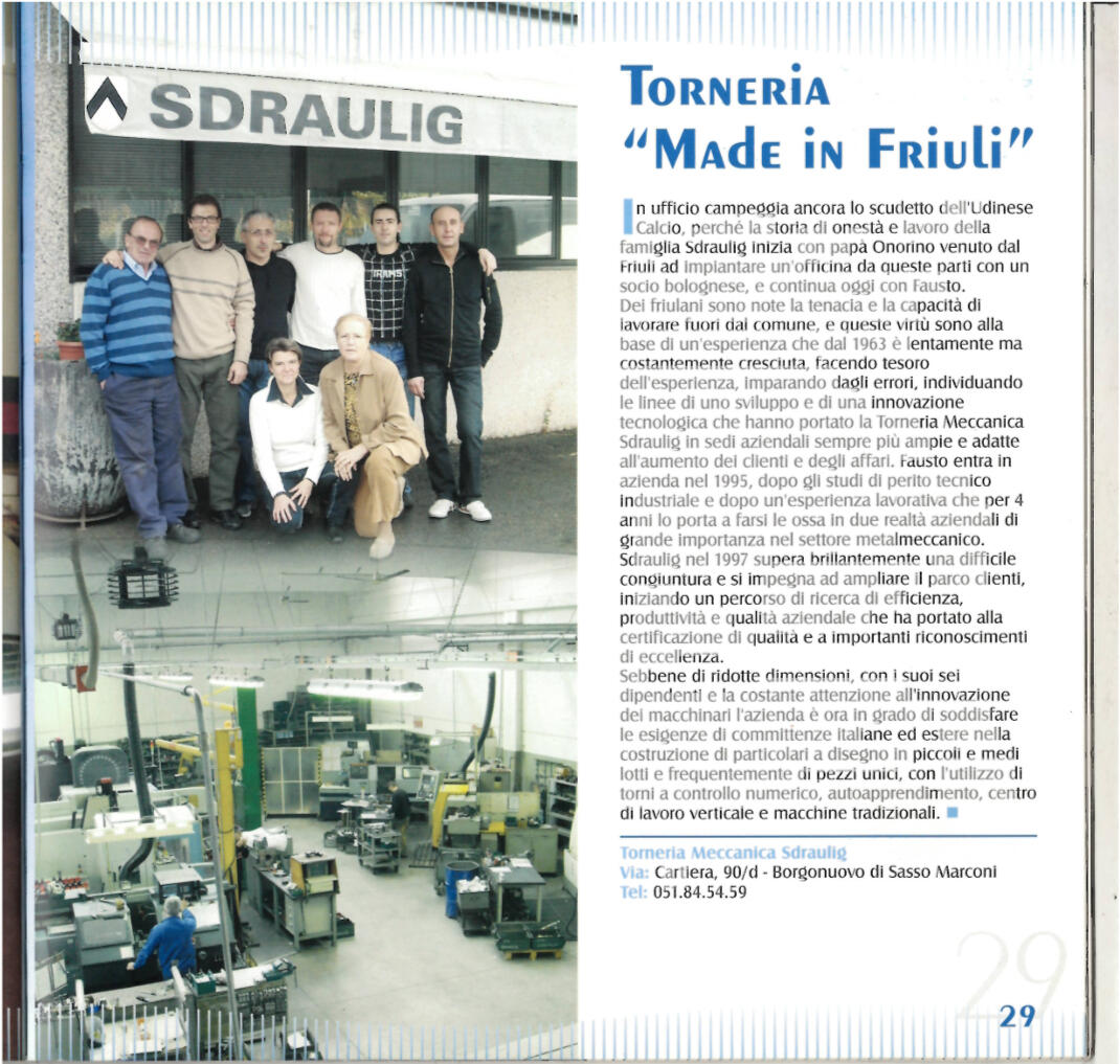 La T M Sdraulig srl, fondata nel 1963 da Sdraulig Onorino, certificata UNI EN ISO 9001:2015, opera nella costruzione di particolari meccanici di precisione in piccoli lotti e pezzi unici per il mercato italiano e tedesco, con l’utilizzo di macchine a controllo numerico e tradizionali.Il titolare, Fausto Sdraulig, gestisce l'azienda e grazie ad uno staff solido, ha provveduto negli anni al continuo miglioramento con l’ottenimento della certificazione di qualità e l'acquisto di macchine utensili aggiornate nell'ottica della sostenibilità ambientale dei processi.Il fine aziendale è quello di cogliere nuove opportunità di mercato e di soddisfare le esigenze sia dei clienti consolidati che dei nuovi committenti rispettando il codice etico che si è imposto.